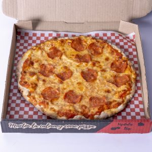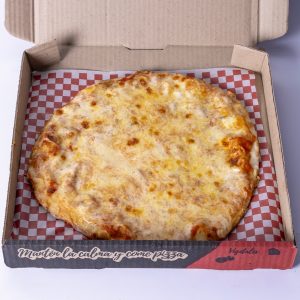 Salsa de tomate San Marzano artesanal, queso mozarella, dividida en 4 sabores – Del Huerto – Pollo Champiñón – Pepperoni – Hawaiana