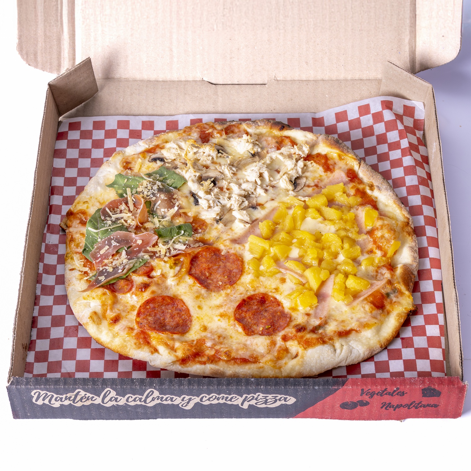 Salsa de tomate San Marzano artesanal, queso mozarella, dividida en 4 sabores – Del Huerto – Pollo Champiñón – Pepperoni – Hawaiana