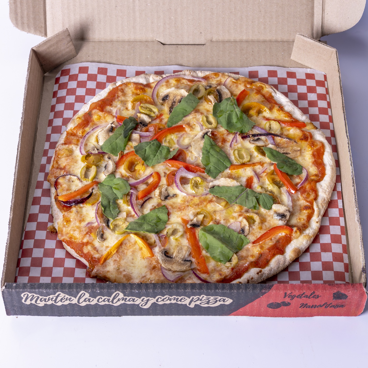 Salsa de tomate San Marzano artesanal, queso mozzarella, tomate cherry, cebolla morada, pimentón rojo, champiñones, aceitunas y rúgula bañada en aceite de olivas